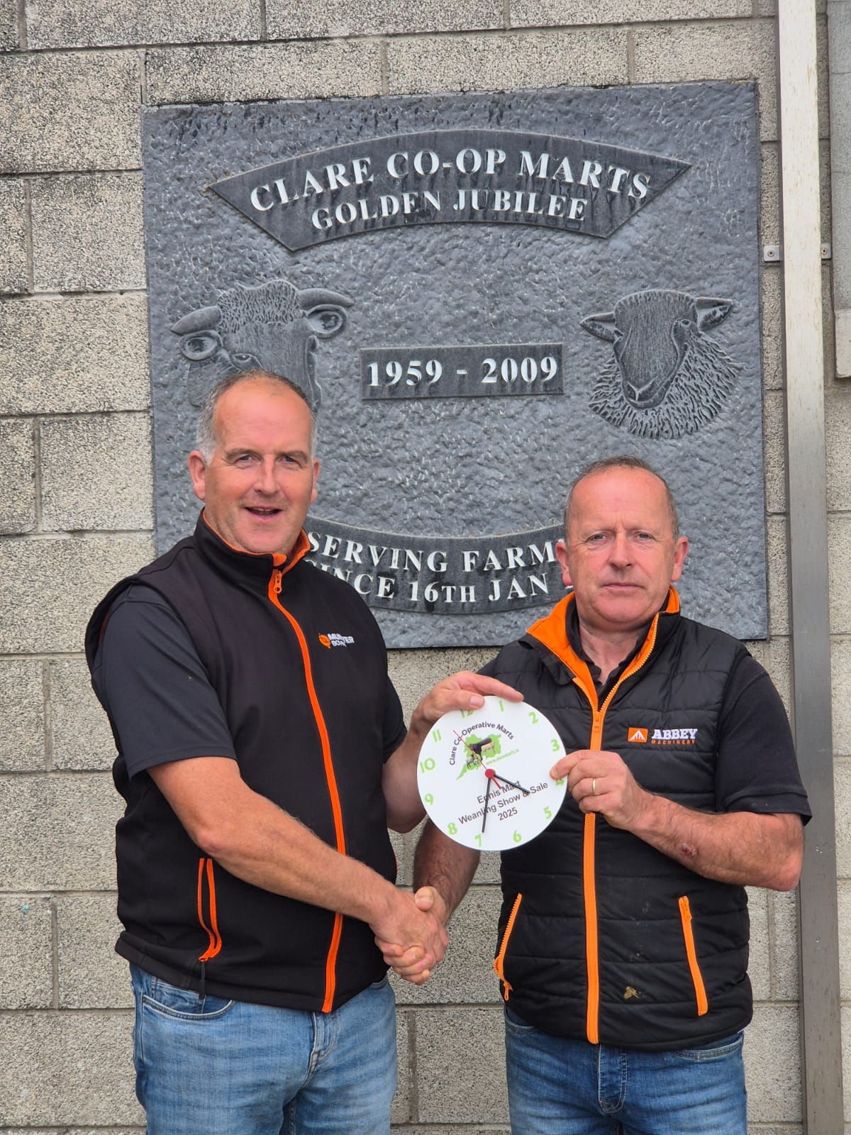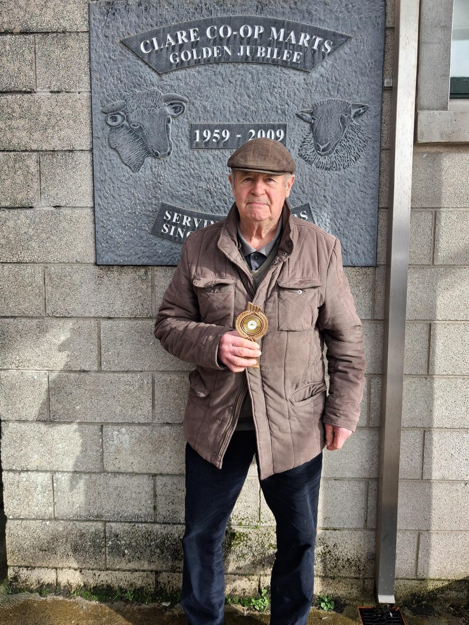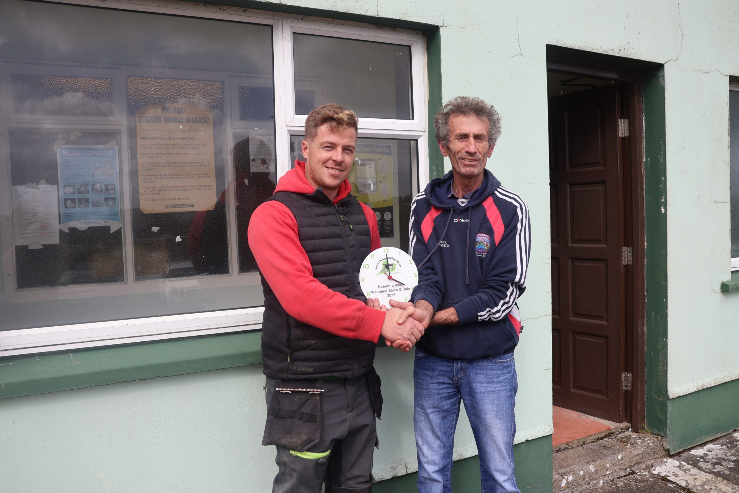 Kilrush Mart Cattle Show & Sale 2025 Gerry Stafford receiving his prize for Group of 2 Store Bks from Eoin Hurley Clare Marts.