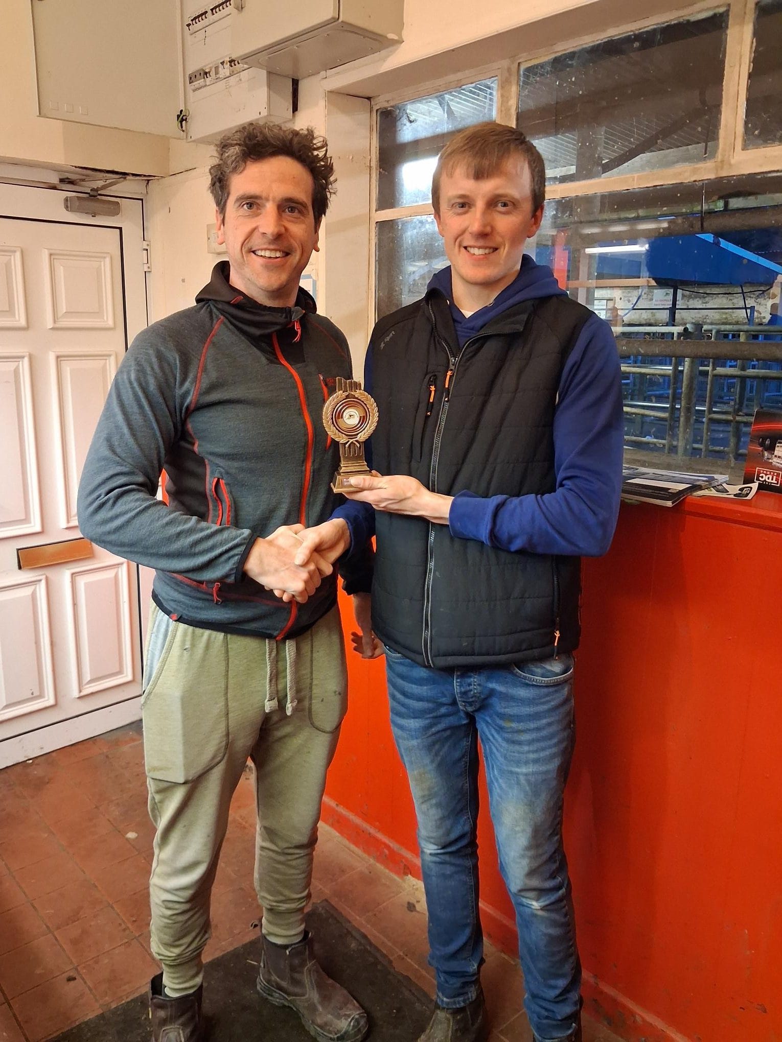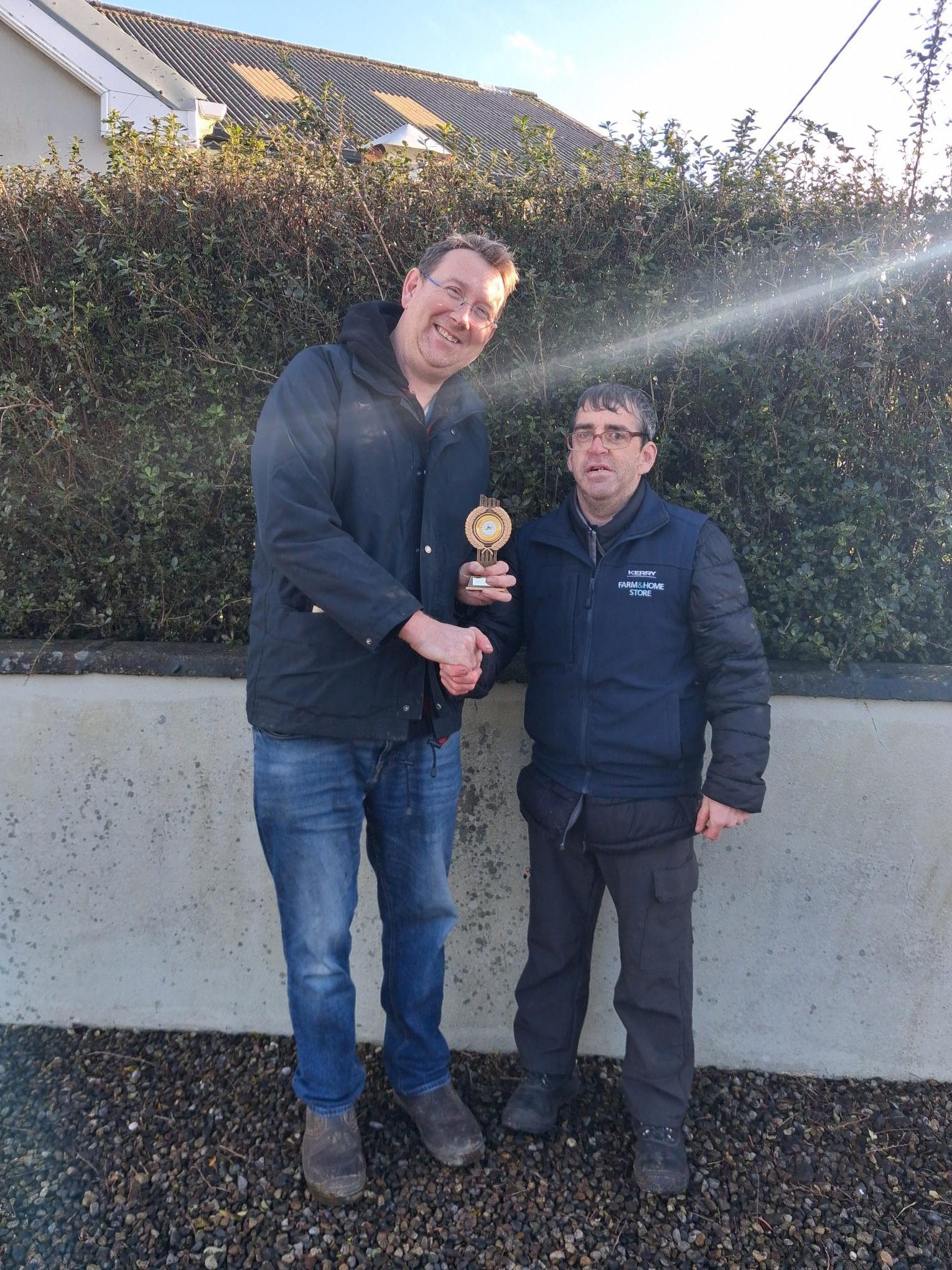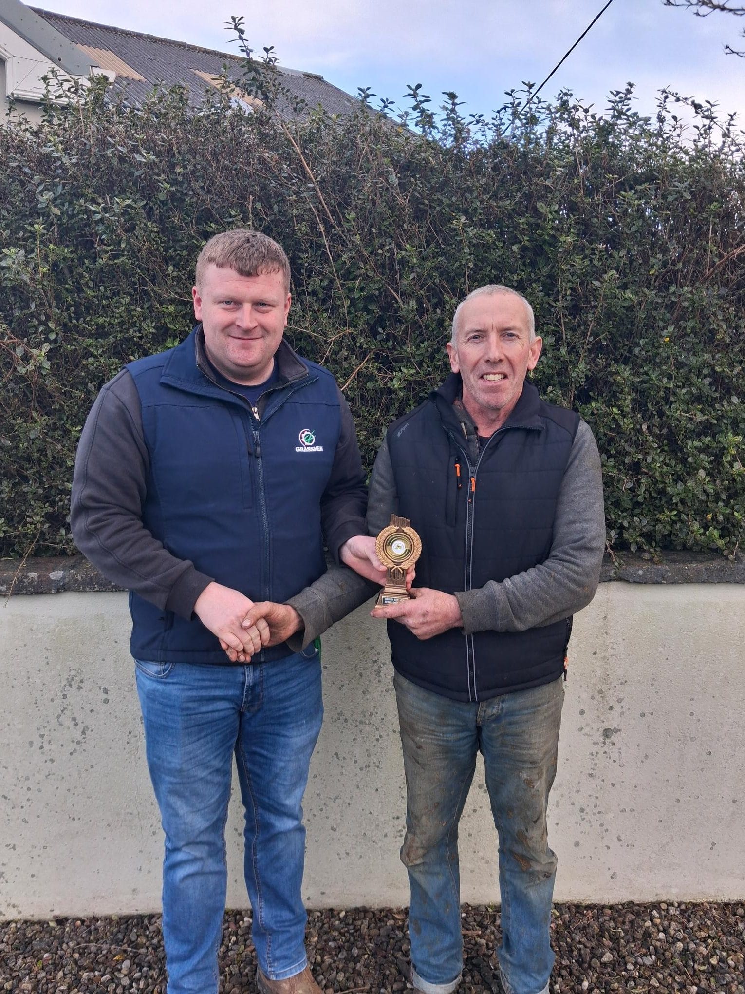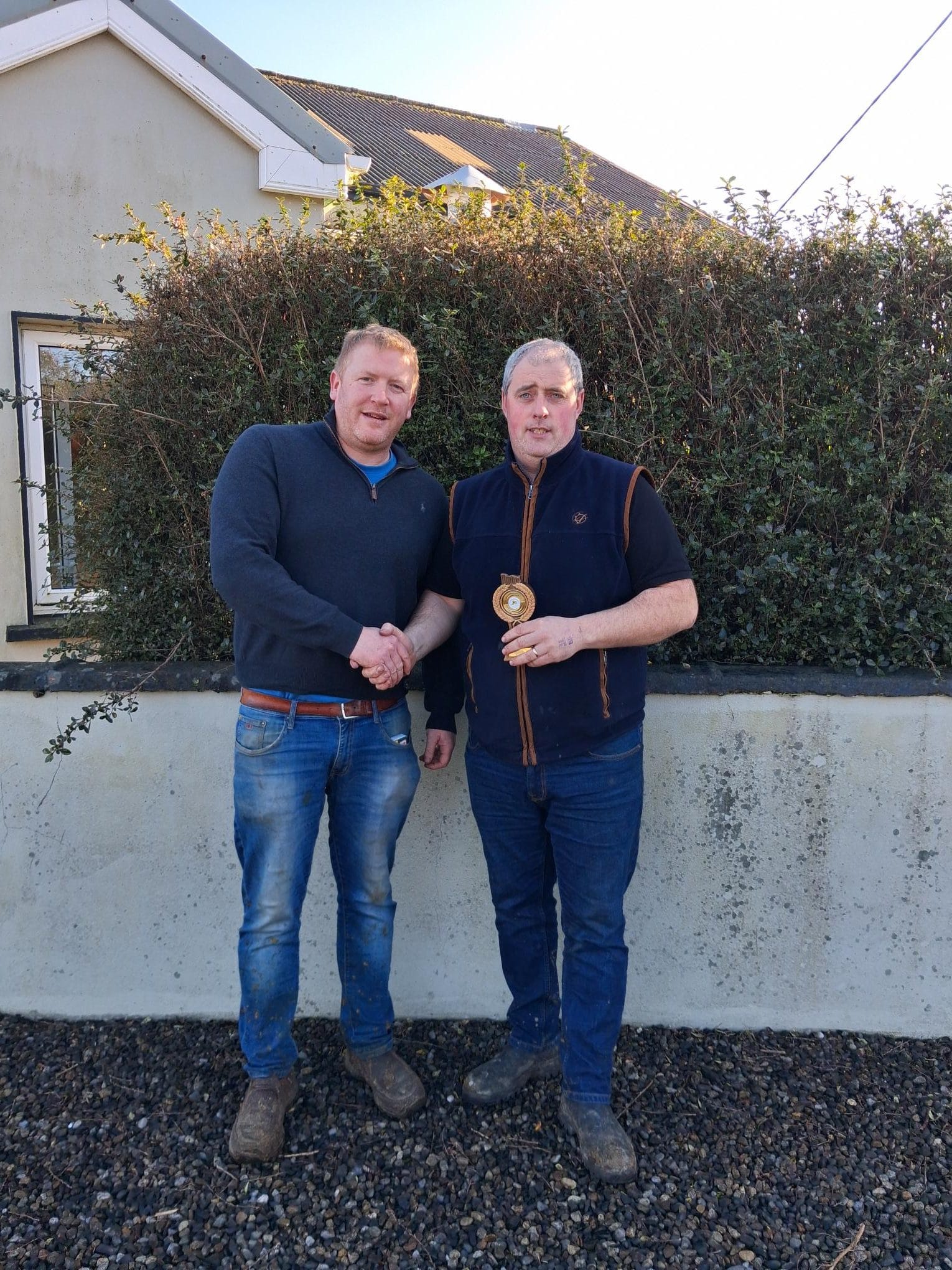 Kilrush Mart Cattle Show & Sale 2025 Gerry Stafford receiving his prize for Group of 2 Store Bks from Eoin Hurley Clare Marts.