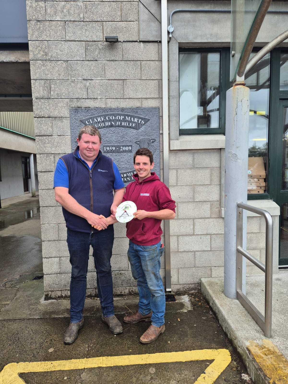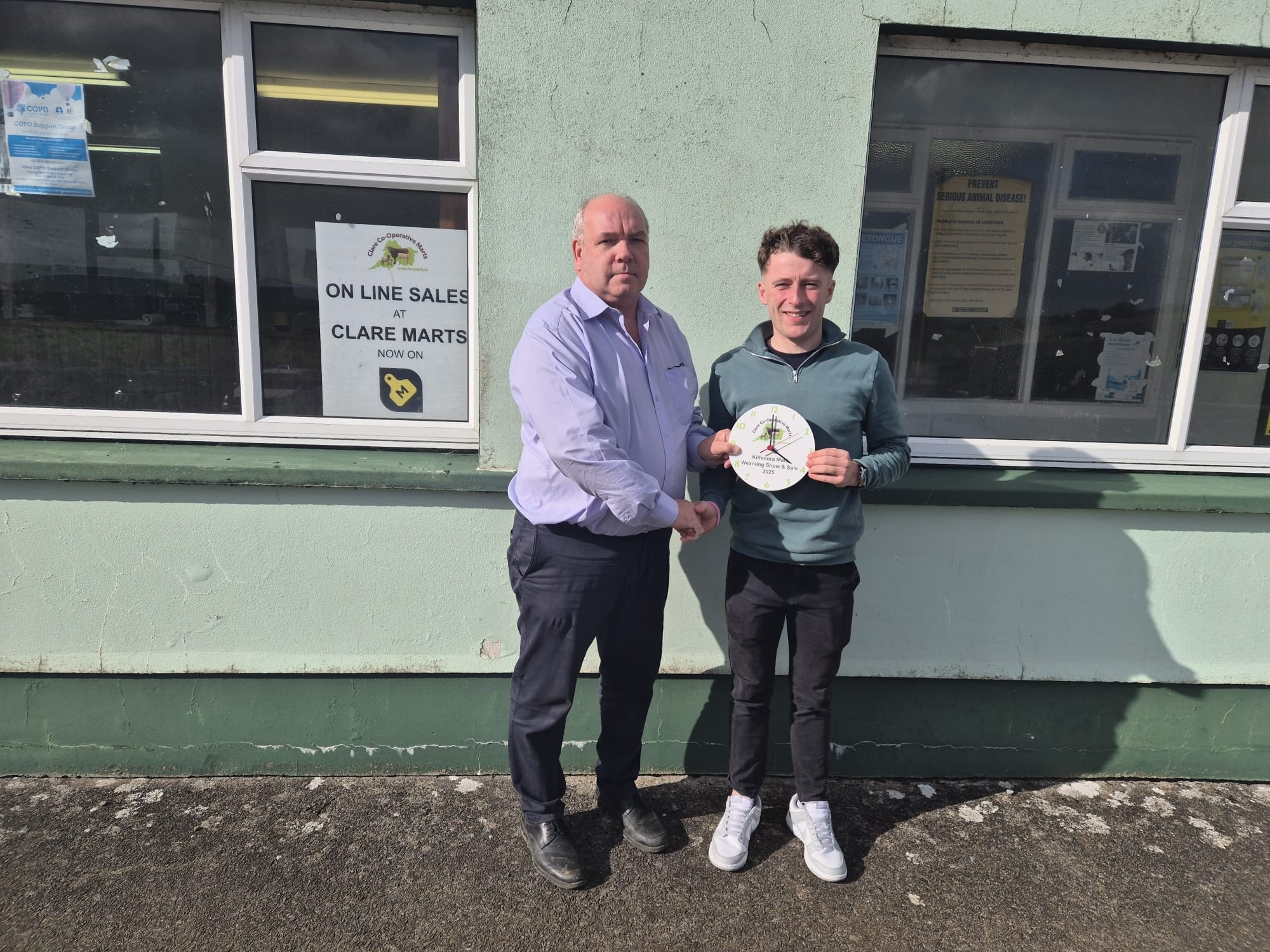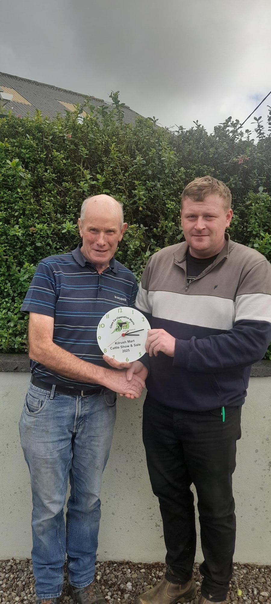 Kilrush Mart Cattle Show & Sale 2025 Martin Fennell receiving his prize for 1 Beef Hfr any age any breed from Eoin Hurley Clare Marts.