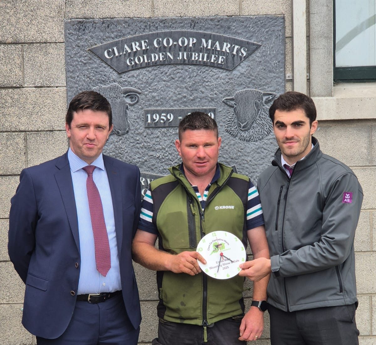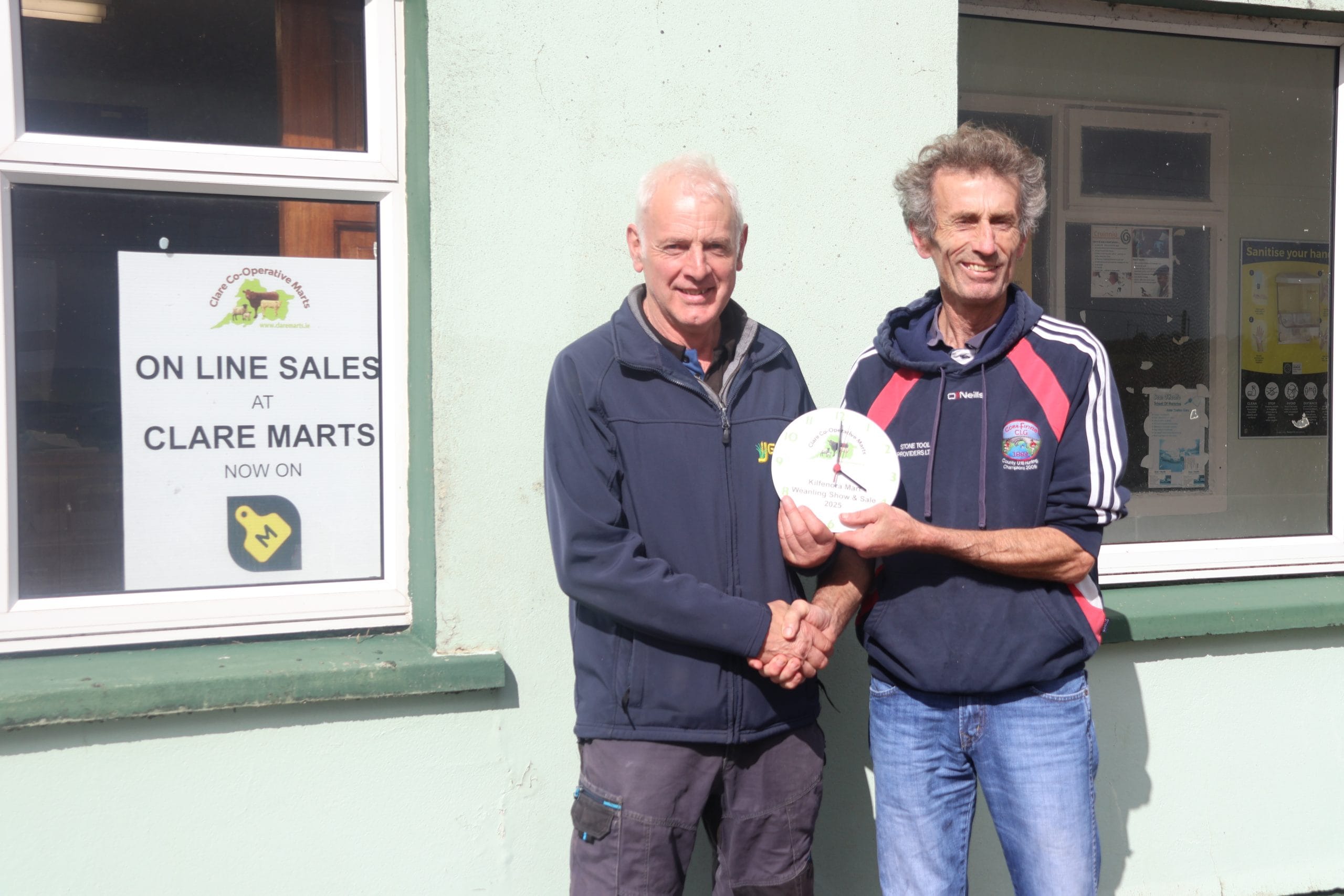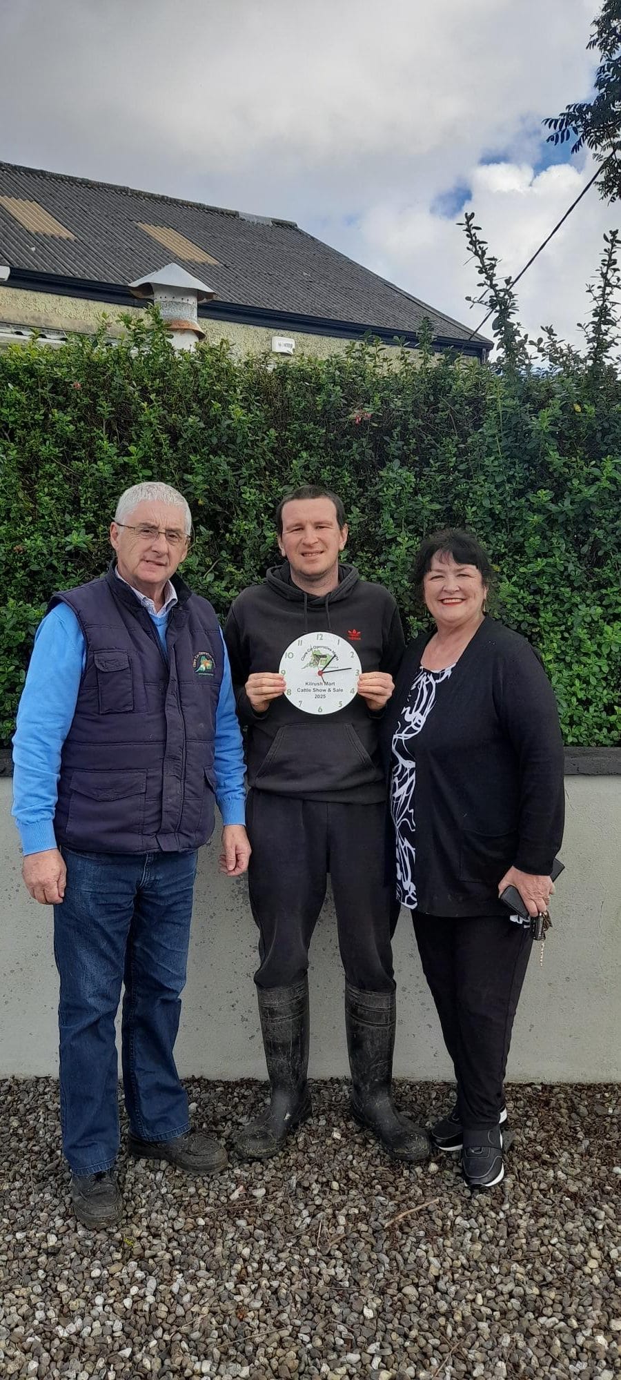 Kilrush Mart Cattle Show & Sale 2025 Flan Keane receiving his prize for 2 or more Beef Bks Continental Breed from Conor Nugent Clare Marts.